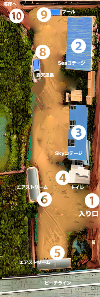 ビーチ側コテージがSeaコテージ(定員5名 1部屋) ビーチライン側のコテージがSkyコテージ(2人部屋 ×3部屋)になります。